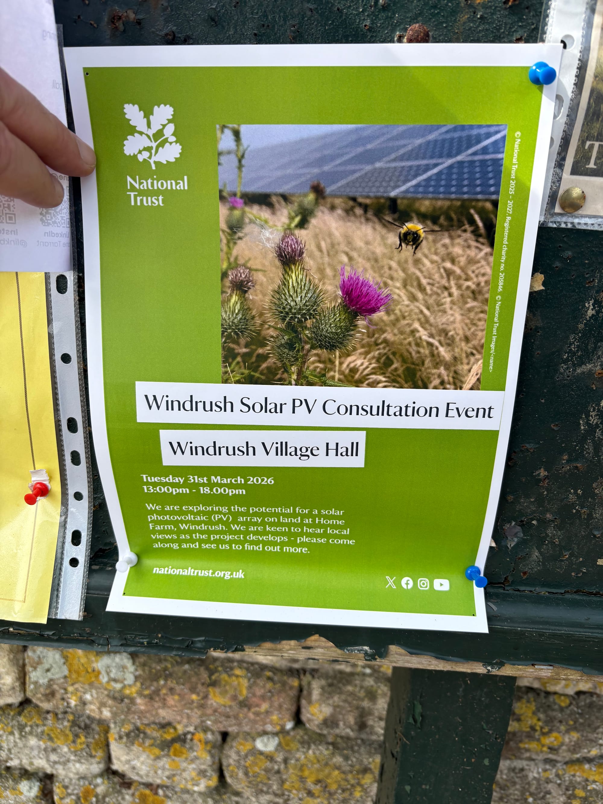 This refers to a drop in session to allow us to understand the developing plans for a solar array just to the West of Windrush Camp on the far side of the A40, I think just out of sight of the road. My understanding is (and I may be wrong ) is that the proposal might include the creation of a cooperative of the NT Renewable Energy team and local residents and businesses, which could result in discounted electricity for residents off Sherborne and Windrush. I saw an article in the press a few weeks ago suggesting that the NT renewable team had struggled last year but the current Gulf crisis probably changes all the equations back in favour of such projects. I note that this is not the local NT team but a team based in the North -East specialised in dealing with such projects. I, like many of you, will be interested and I'm sure there will be planetary of questions. See you there, maybe.