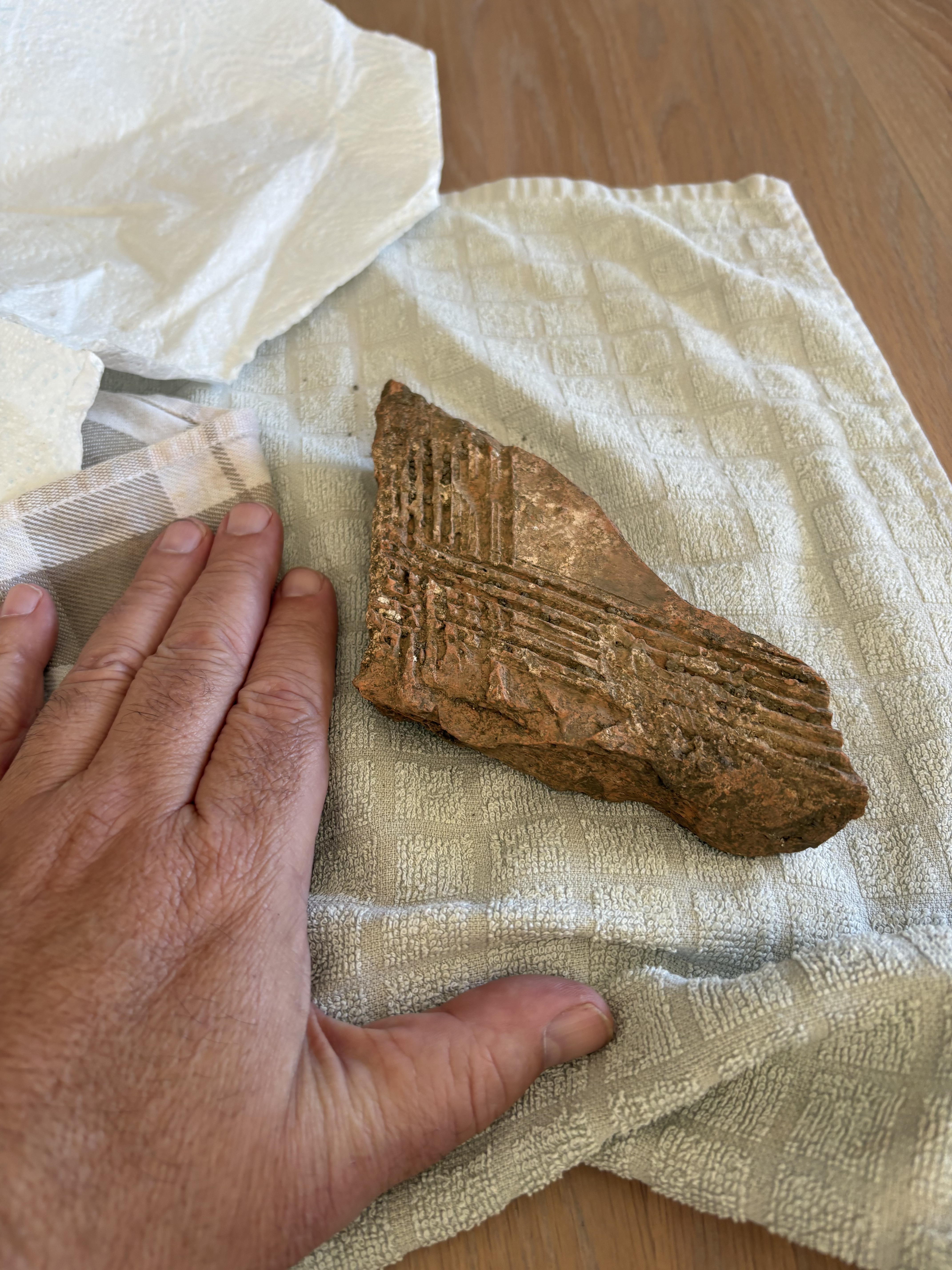 The piece of terracotta has been grooved with some sort of comb with perhaps six or seven “teeth”.