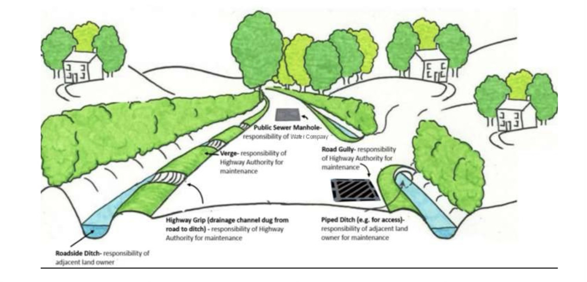 Theoretically it is the County Council Highways department who are responsible for arranging the grips to be cleared and gullies (which collect silt) to be emptied. It is the landowners responsibility to keep ditches and drains clear.