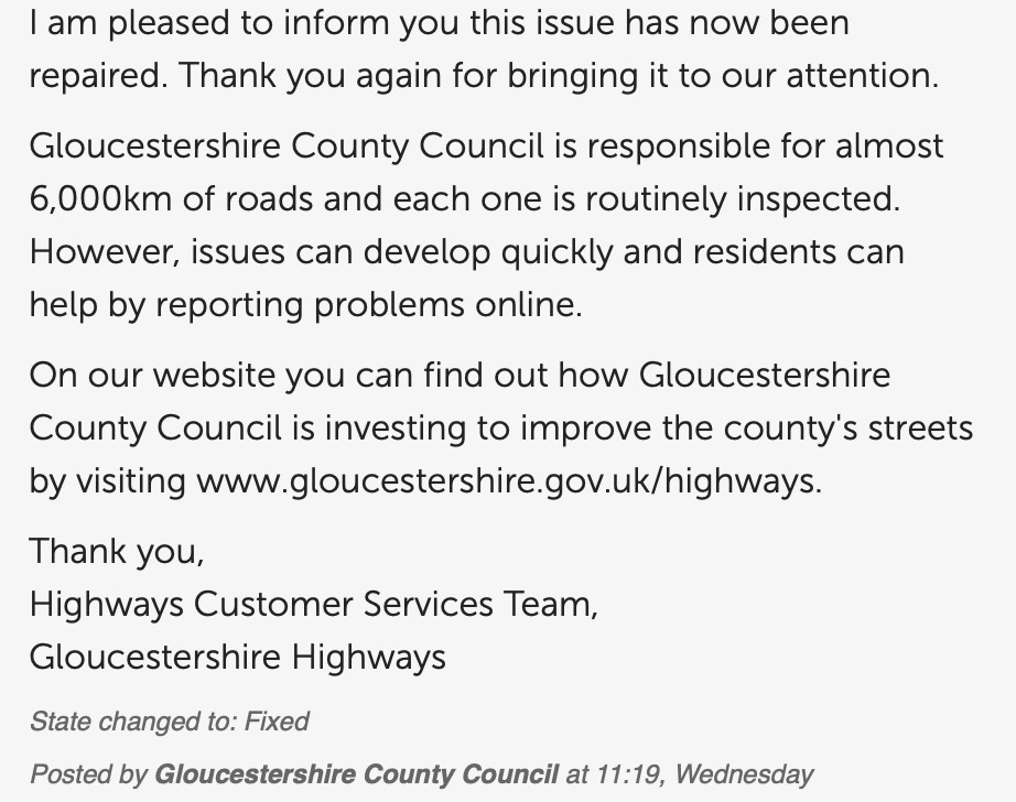 A few weeks ago on 27 January I became frustrated with the short-sighted approach of the Highways Department who seemed happy to fill the holes (not very well in my opinion) and return barely weeks later to repeat the exercise without addressing the cause, so I specifically reported the gravel beach and rocks on “fixmystreet”. I got the task number 7038682. As usual the report was acknowledged and I received an update saying the matter would be addressed. Yesterday at 11.19 I received an update from Gloucestershire County Council saying the matter had been addressed and repaired.
