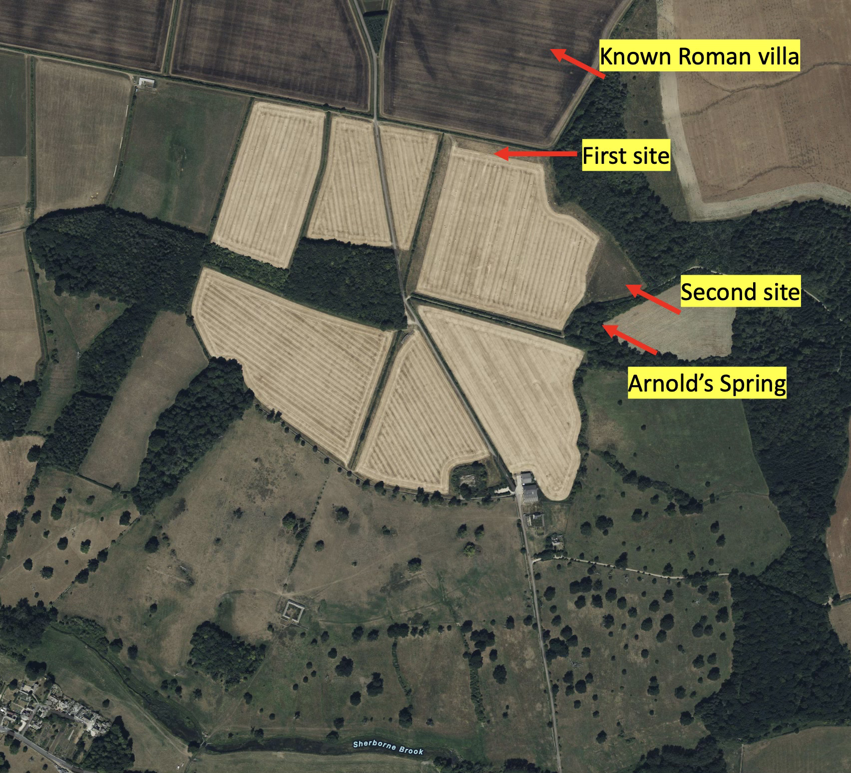 Note too, that just East of the Roman villa in the first image above there are two streams running away towards the the Windrush. I suggest that the source of these streams are springs which fed the villa - maybe worthy of a little more investigation in the tree line immediately East of the villa site, the northern end of the wood called Leasow (or Leassow) Furlong. I’ll ask the NT if I can go there in due course and take some photos perhaps and report back to you.