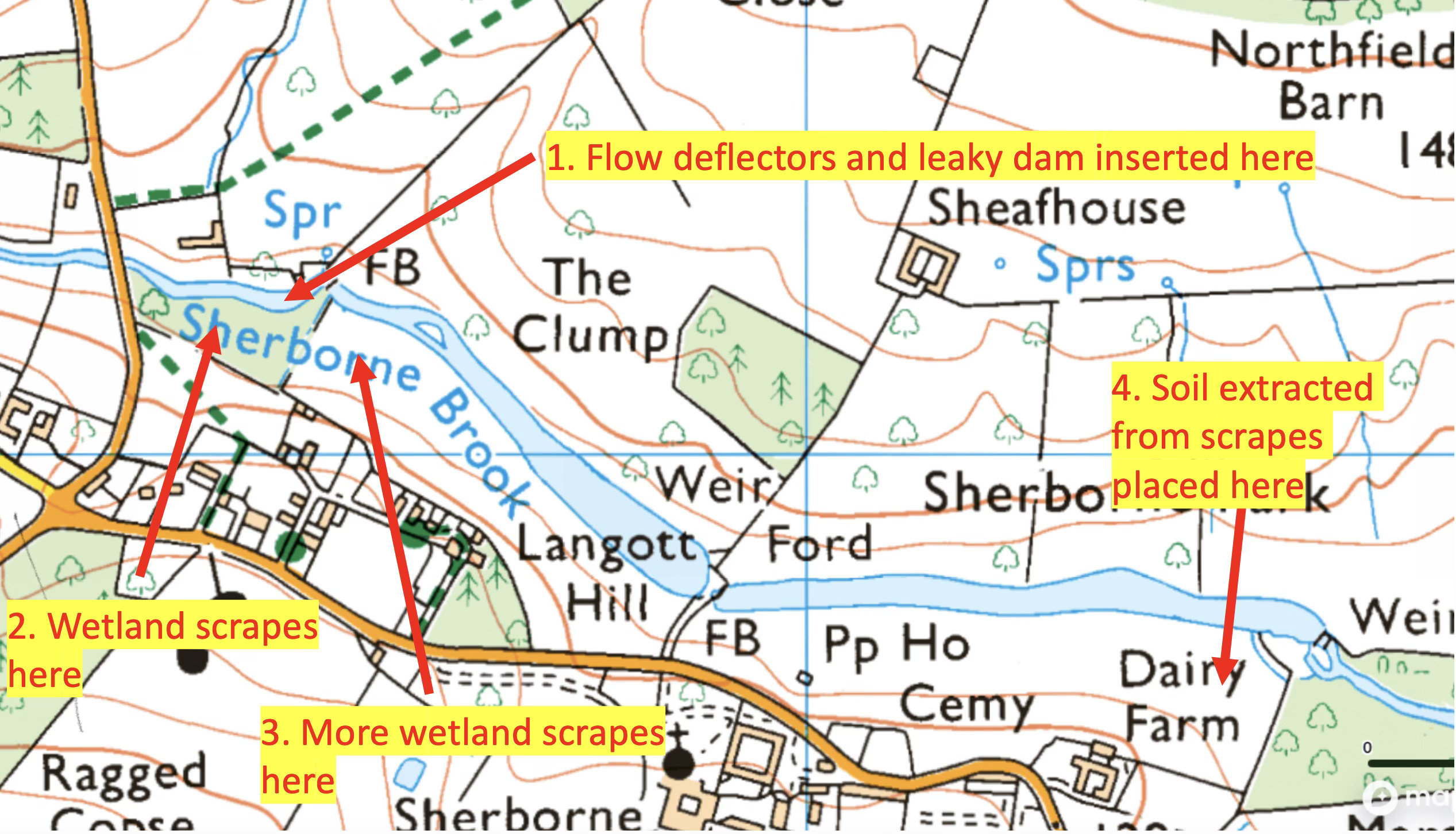 Some of the mapping used in the planning can be confusing so I thought the image below using a more familiar map may help give you context. I don’t think what I show below is incorrect. The scrapes at 2 and 3 will be bulldozed and the excess material taken down the side of the brook to area 4.