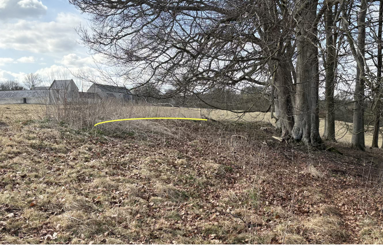 And here, below, looking west is a representation in the yellow line of what I imagine might be the length of the possible barrow. In a perfect barrow there would be a ditch and a rise in the ground on the southern side, but given this lies on the edge of a field that no doubt was once ploughed I’d expect the ditch to fill in over time, and also on the downward northern slope that would erode down the hill in time.