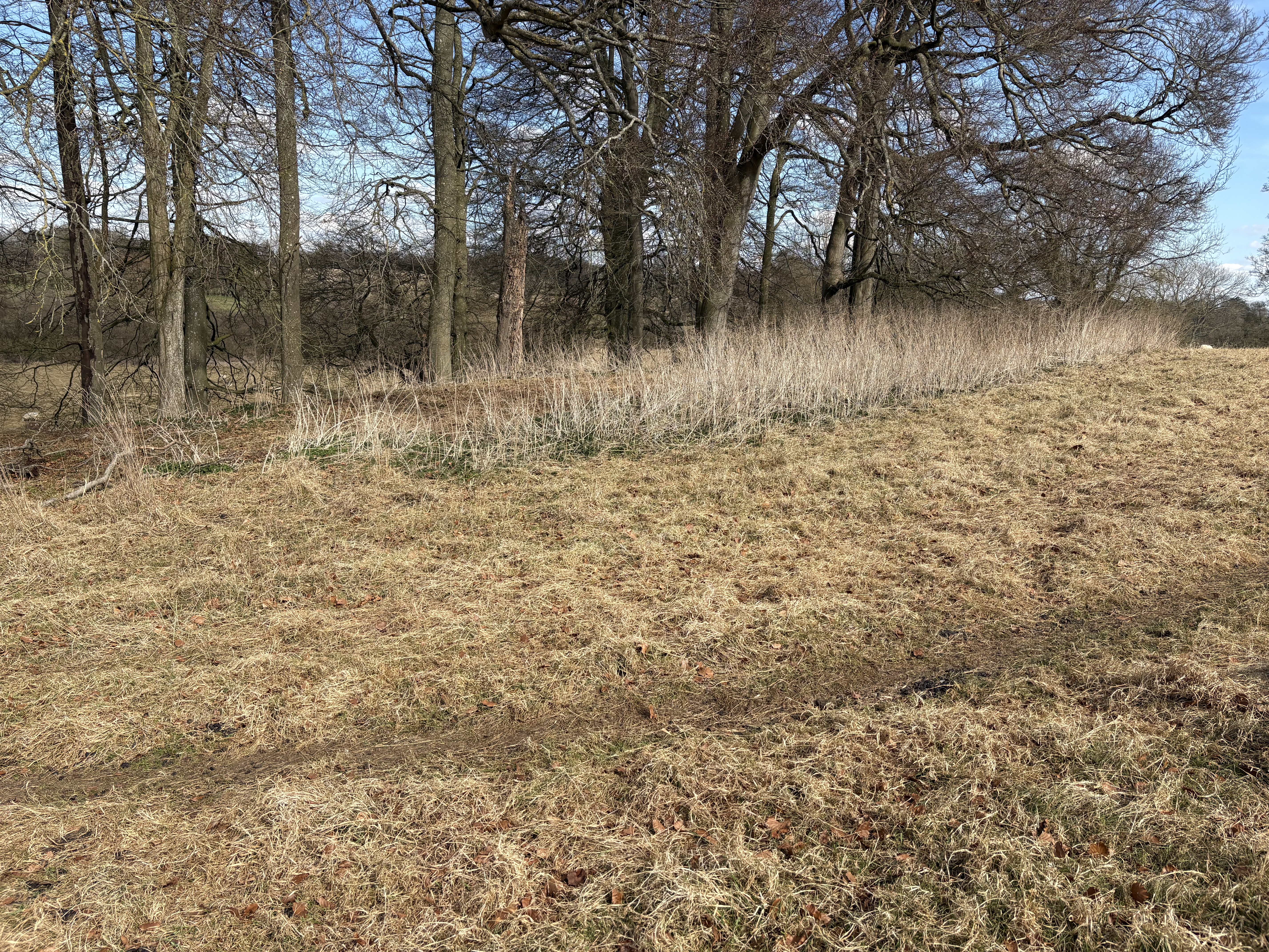 Above, the suspect area from the south, and below closer, with the possibility of a barrow running along the line of the tall vegetation. The trees are just beyond, planted down the side of the escarpment. The springs are at the base of this slope, straight ahead from the point here.