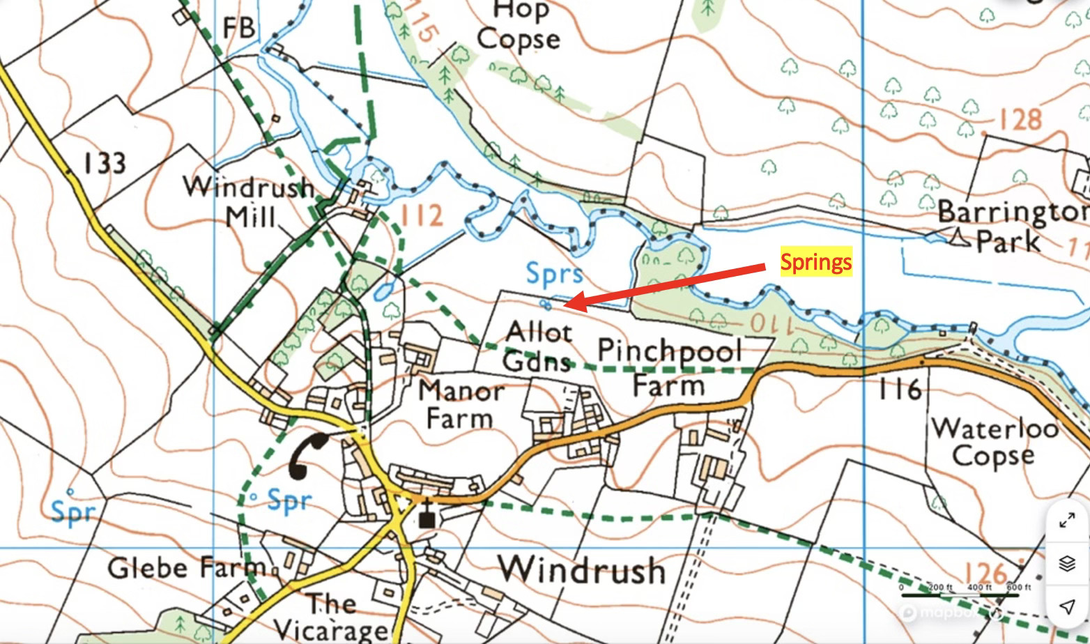 My next step was to consult a modern Ordnance Survey map. It immediately revealed a small escarpment on the northern boundary of Noseberry field, overlooking the Windrush river valley. The map also showed clear springs marked right on this northern edge. A pathway, possibly ancient, runs east-west a few tens of yards south.