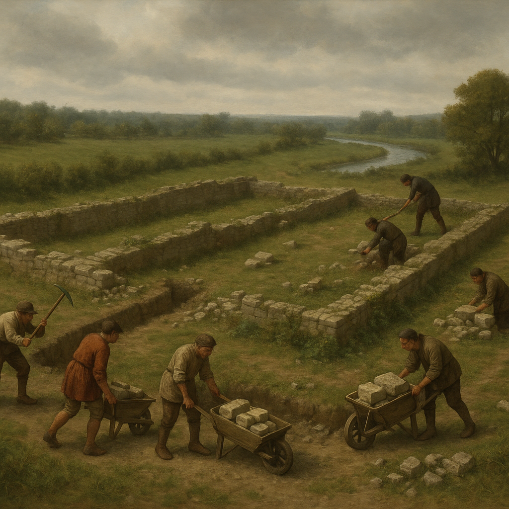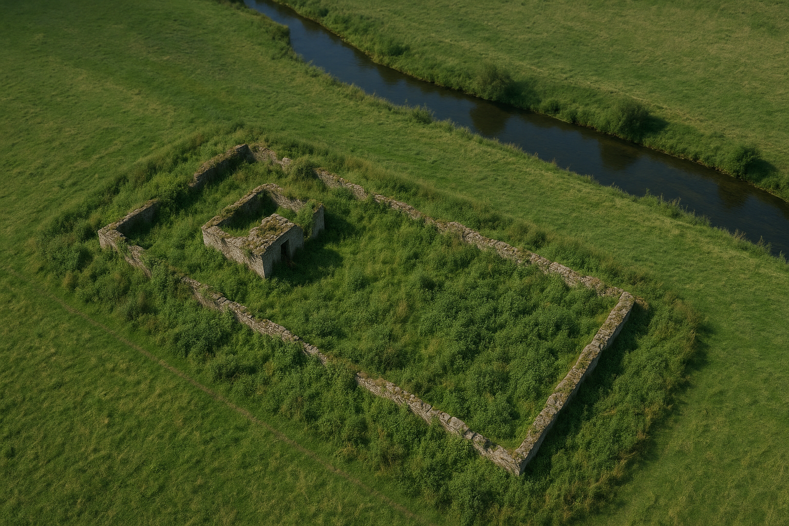 When empire collapsed in the 5th century, our villa fell silent. Roof tiles slipped, walls tumbled, and centuries of weather weakened careful Roman masonry. The working buildings - less robustly constructed than the main villa - likely disappeared first, their timber frames rotting and stone foundations scavenged piecemeal. maybe this is the ares to the East of the rectangle, where Roman material has been speculatively identified before. Here’s the Historic Environment Record, regrettably not that clear and continuing confused references to a site nearer Broadmoor Farm. By, say 1500 our villa site may have looked something like this: