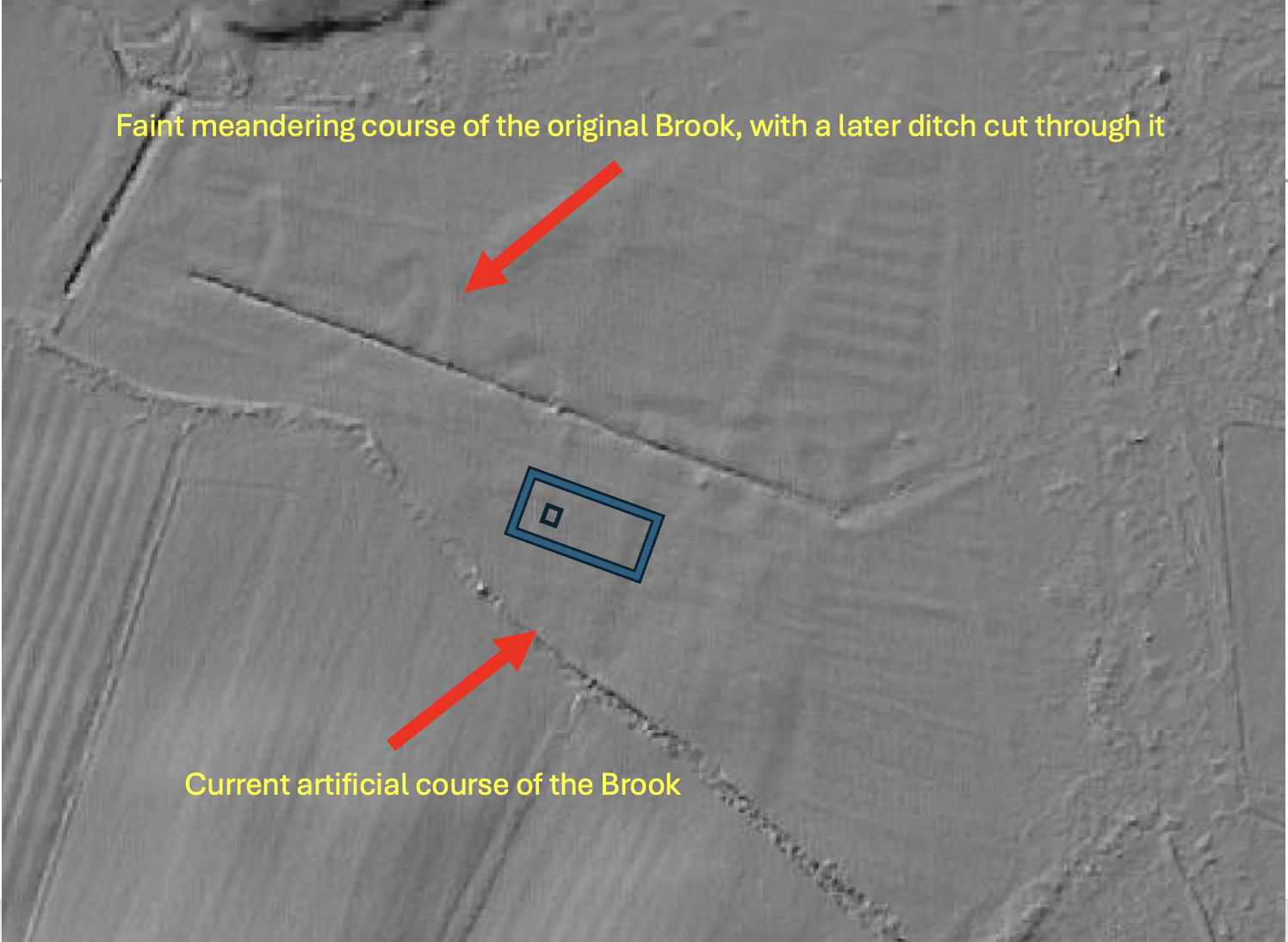 Over subsequent centuries, ploughing and natural soil movement gradually filled these hollows with fertile topsoil, creating the inverted crop marks that puzzled us today. The Brook then runs its current course, with the sluice being used to periodically flood the meadow (“Drowned Meadow”) to the East.