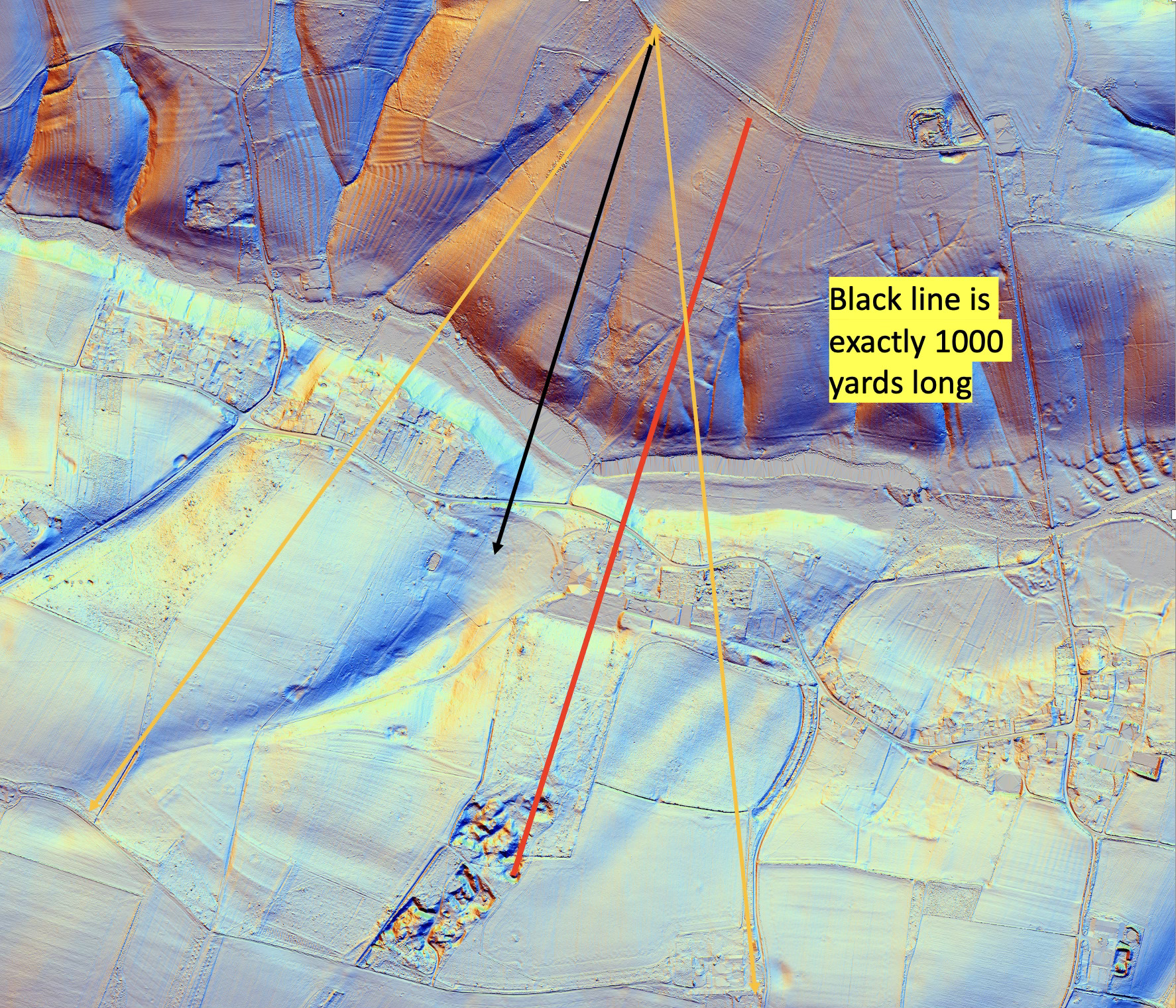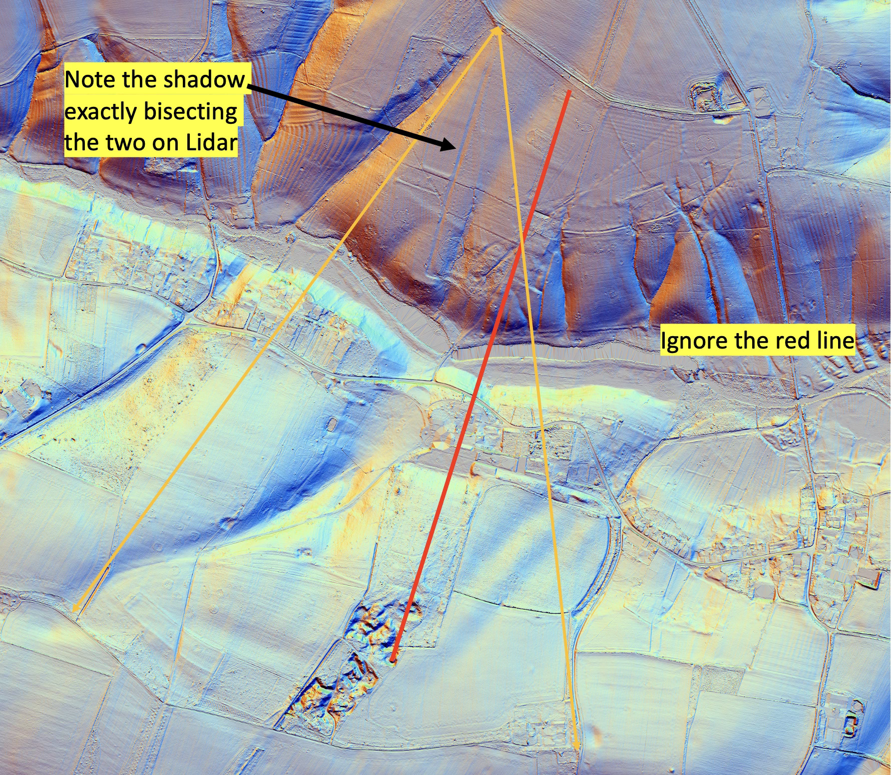Now when we look at the LIDAR image, something else jumps out. A shadow of a track and a row of trees, no longer visible on the ground but once there, bisects the two 1 mile distances, exactly, 20 degrees either side. Curious. (Give me a little leeway for the graphics I’m using and ignore the red line)