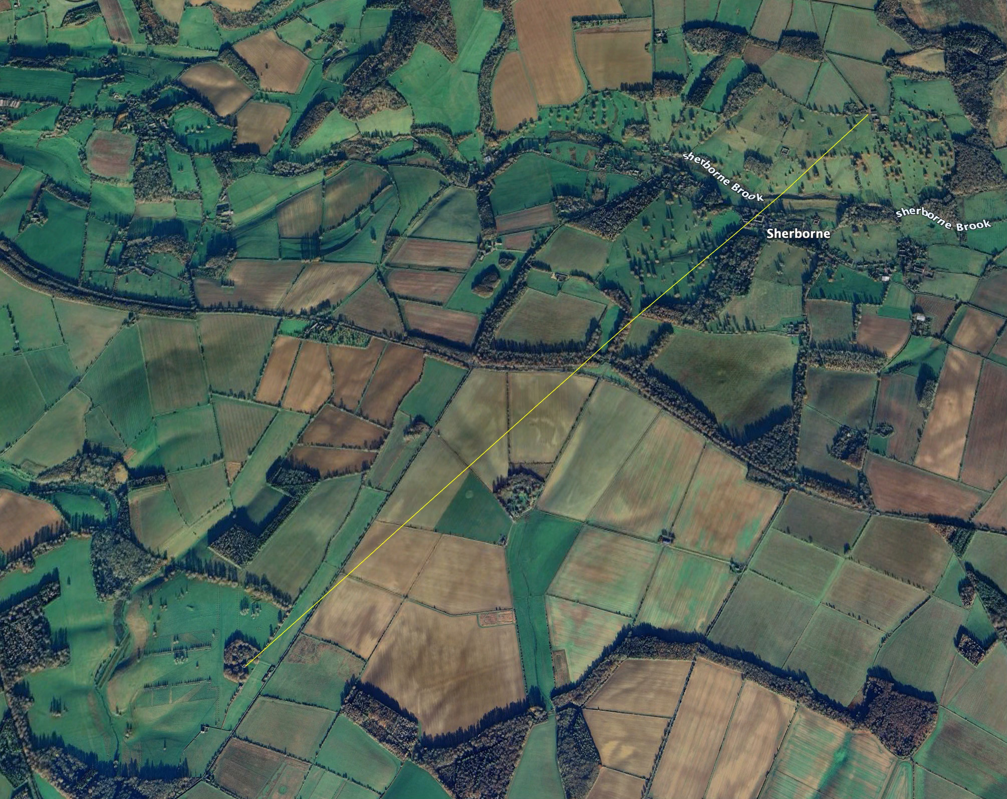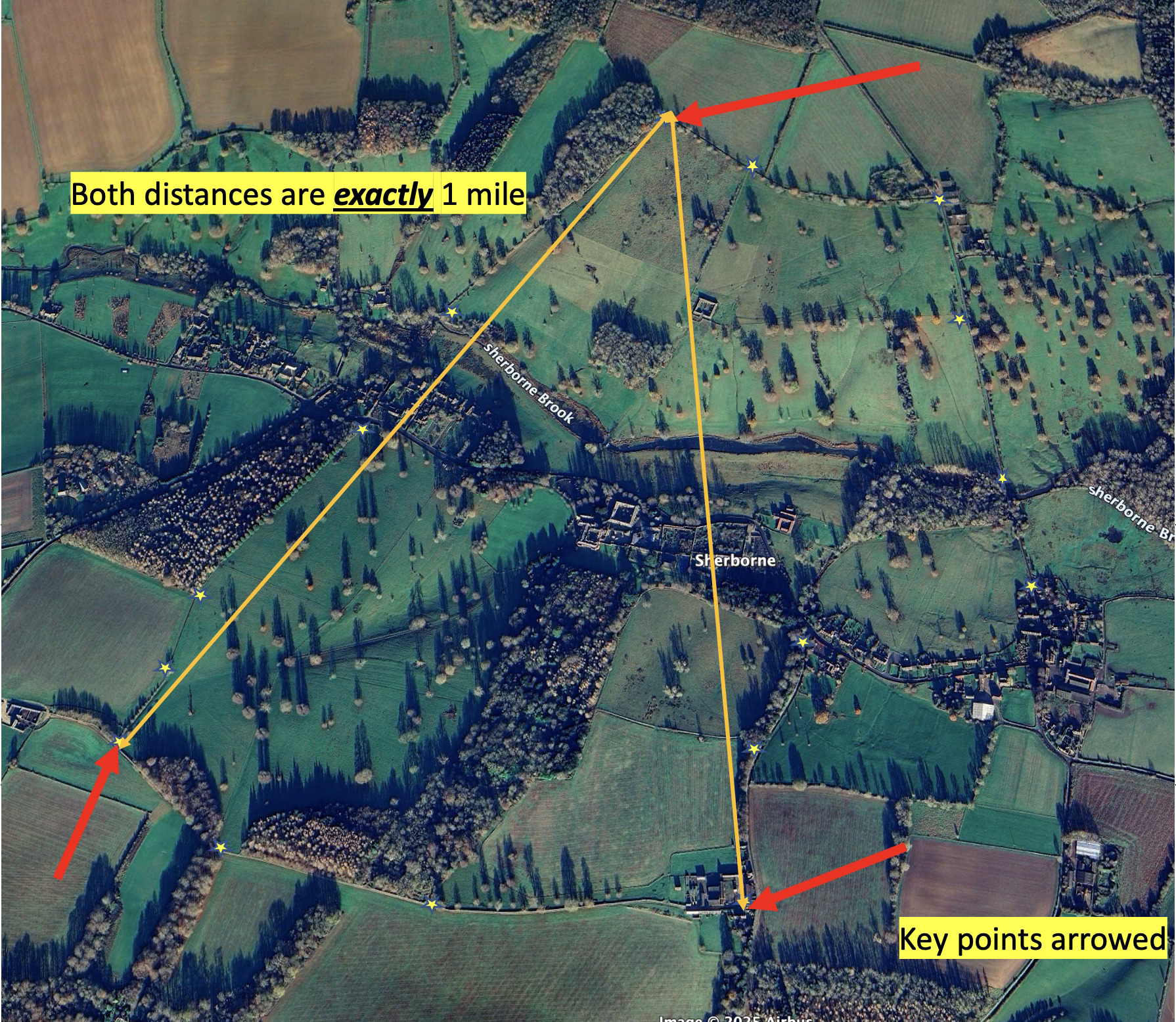Here’s an aerial photo with what I estimate (roughly) are the original boundaries of Sherborne Park. For this piece of analysis the three points highlighted with red arrows are the key - the two Southern Corners and the Northern Corner: