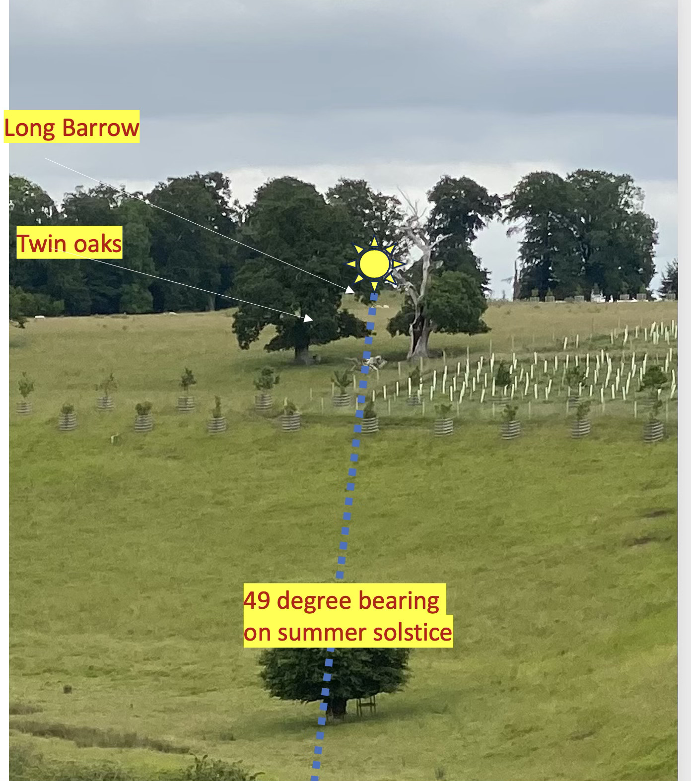 In a recent newsletter I posted a prediction of what I thought the sun rising over the Long Barrow in Lodge Park, near Sherborne might look like. The line below is on the line between the two churches and I predicted that if one stood on that line the sun would rise as if rising from the Long Barrow on the horizon, framed by two 500+ year old oak trees forming a portal.