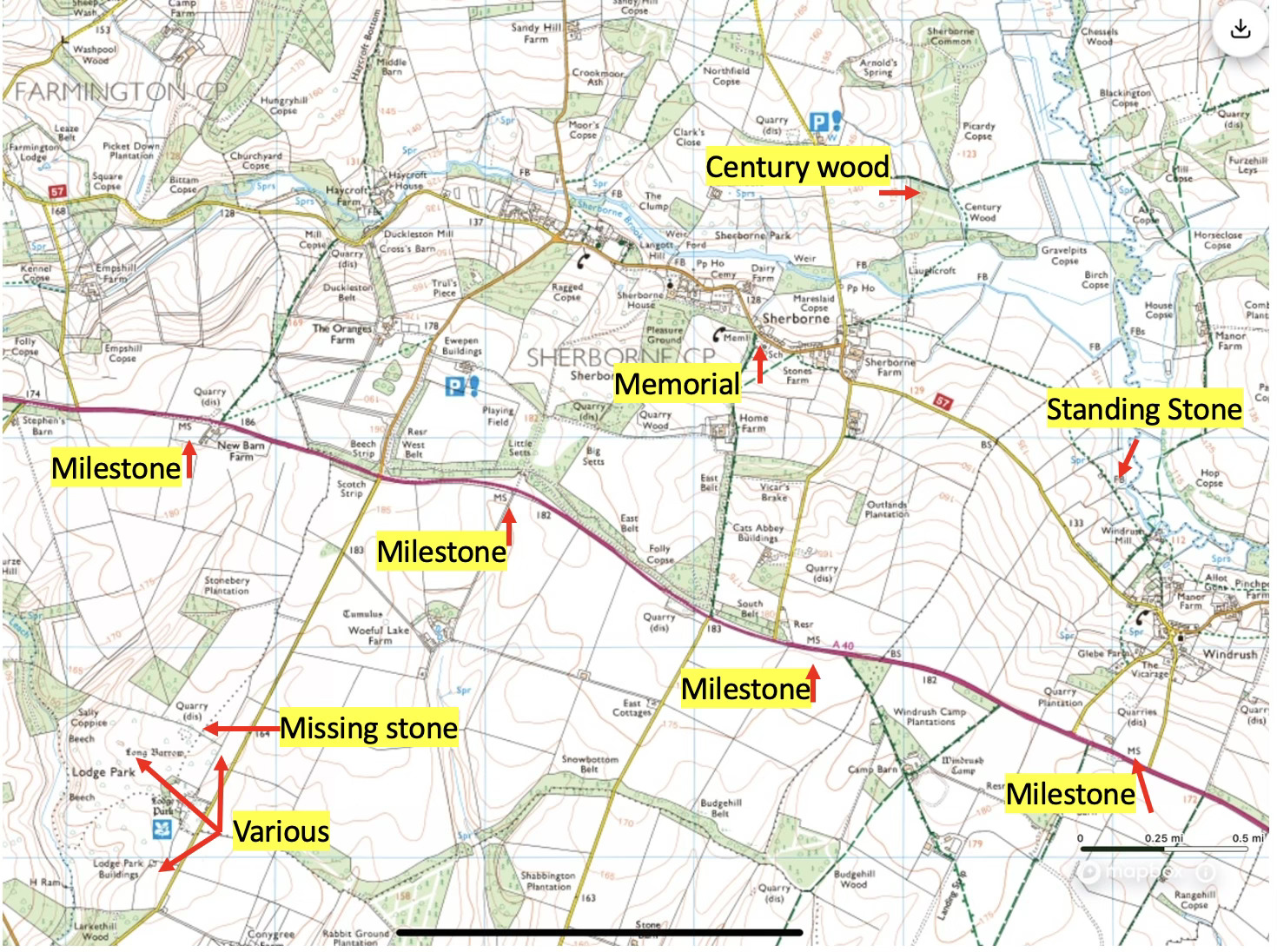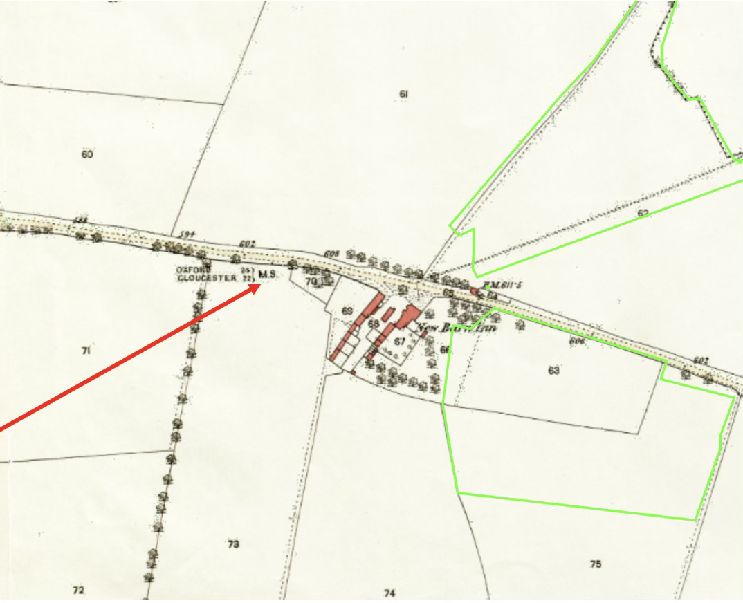 There are significant milestones every mile along the A40. Most remain, some are hidden. The easiest to see is the one just West of New Barn Inn, set back from the verge, with an interesting rounded top.