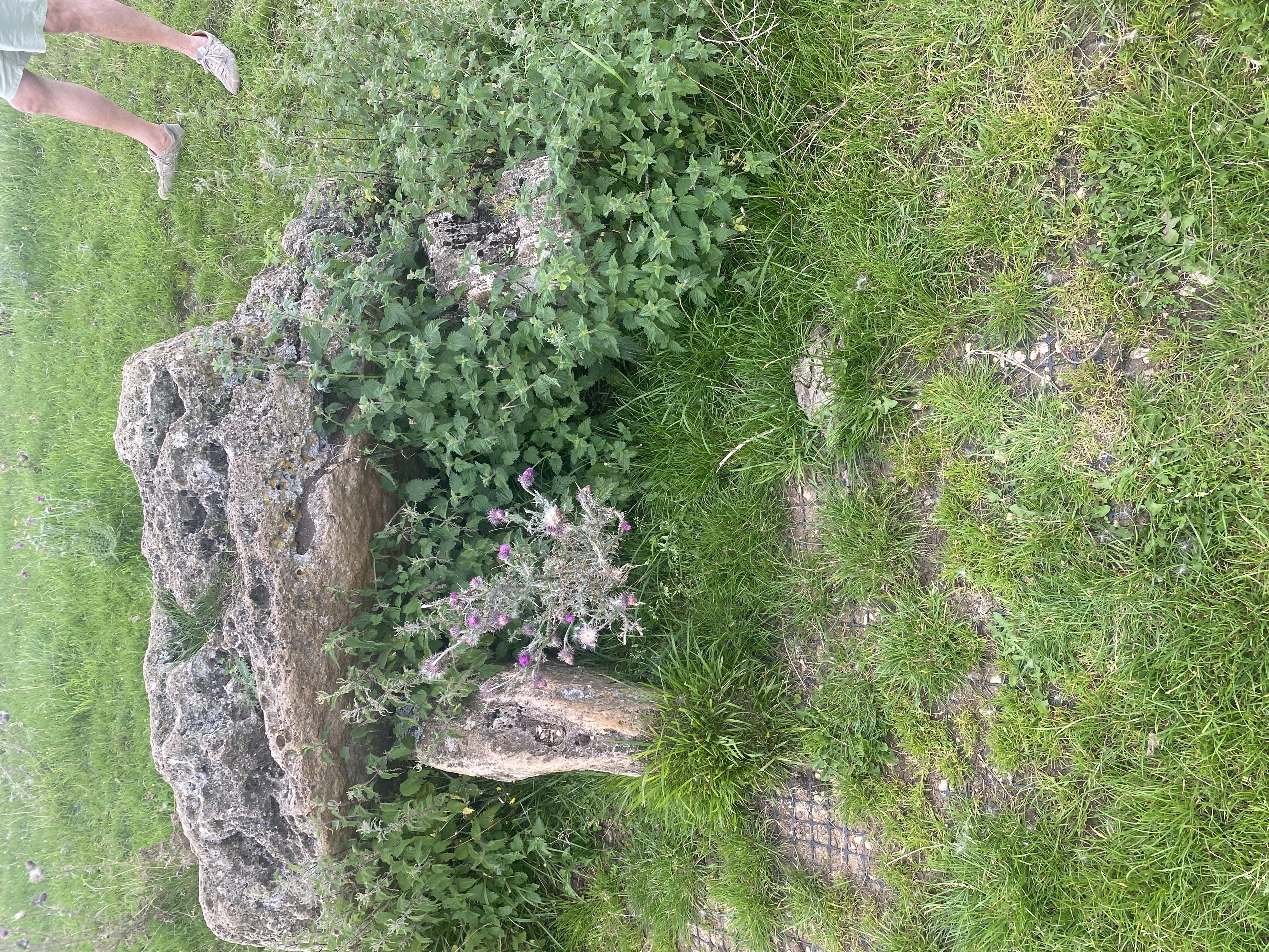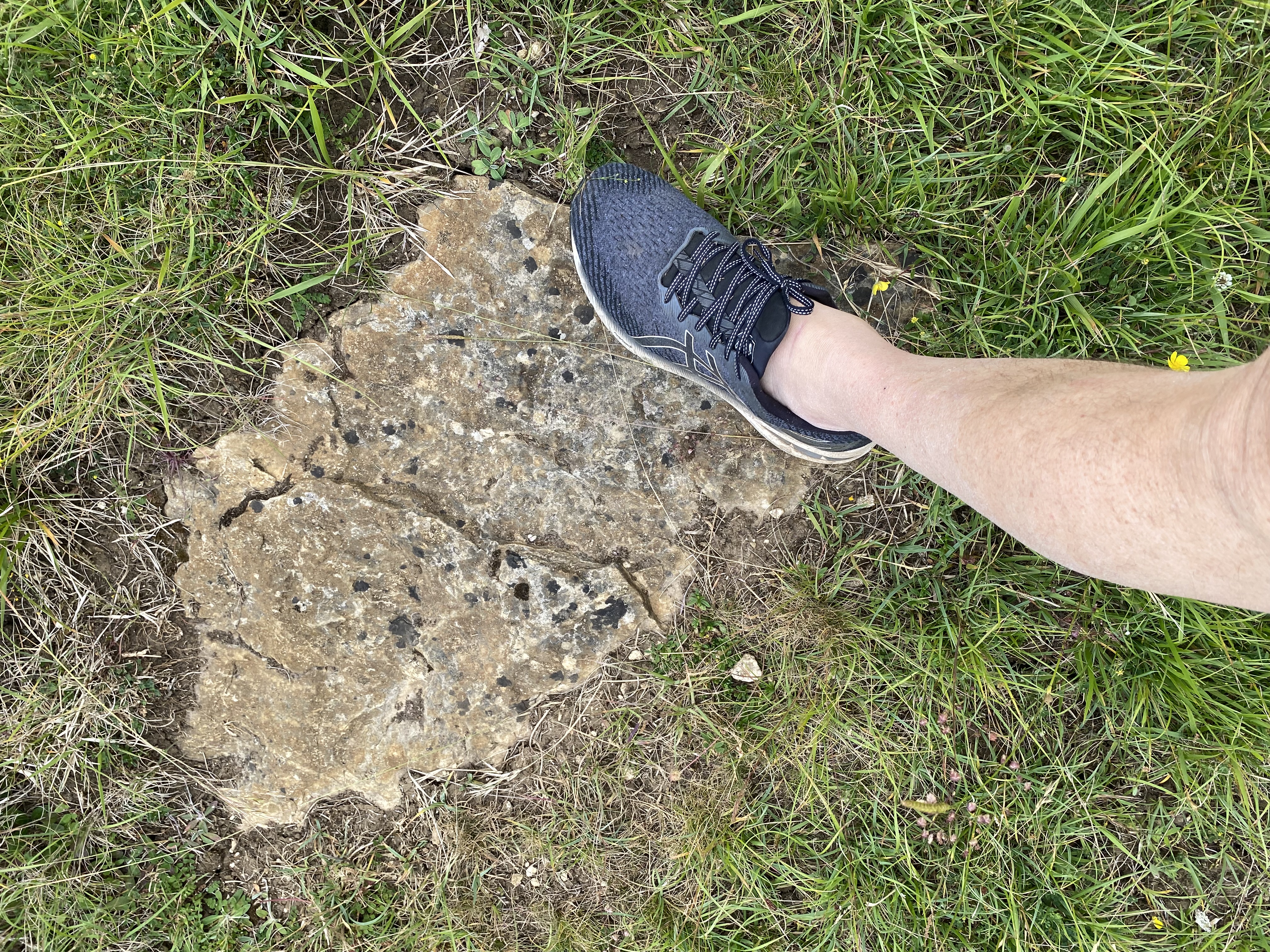 But these are not the only megaliths. In 1925 the antiquarian O.G.S. Crawford noted that he found the tops of other large stones in the vicinity, flush with the grass. It would be very interesting and relatively easy to find these and map them. Not only that, but I have found other large stones elsewhere in Lodge Park, flush with the grass. These could be natural of course, but their locations (which I won’t give away here) suggest otherwise. Here’s a pic (excuse the elegant leg). Gentle probing with a sharp object makes clear this is a massive stone, probably flat faced. This stone is in an area never subjected to ploughing.