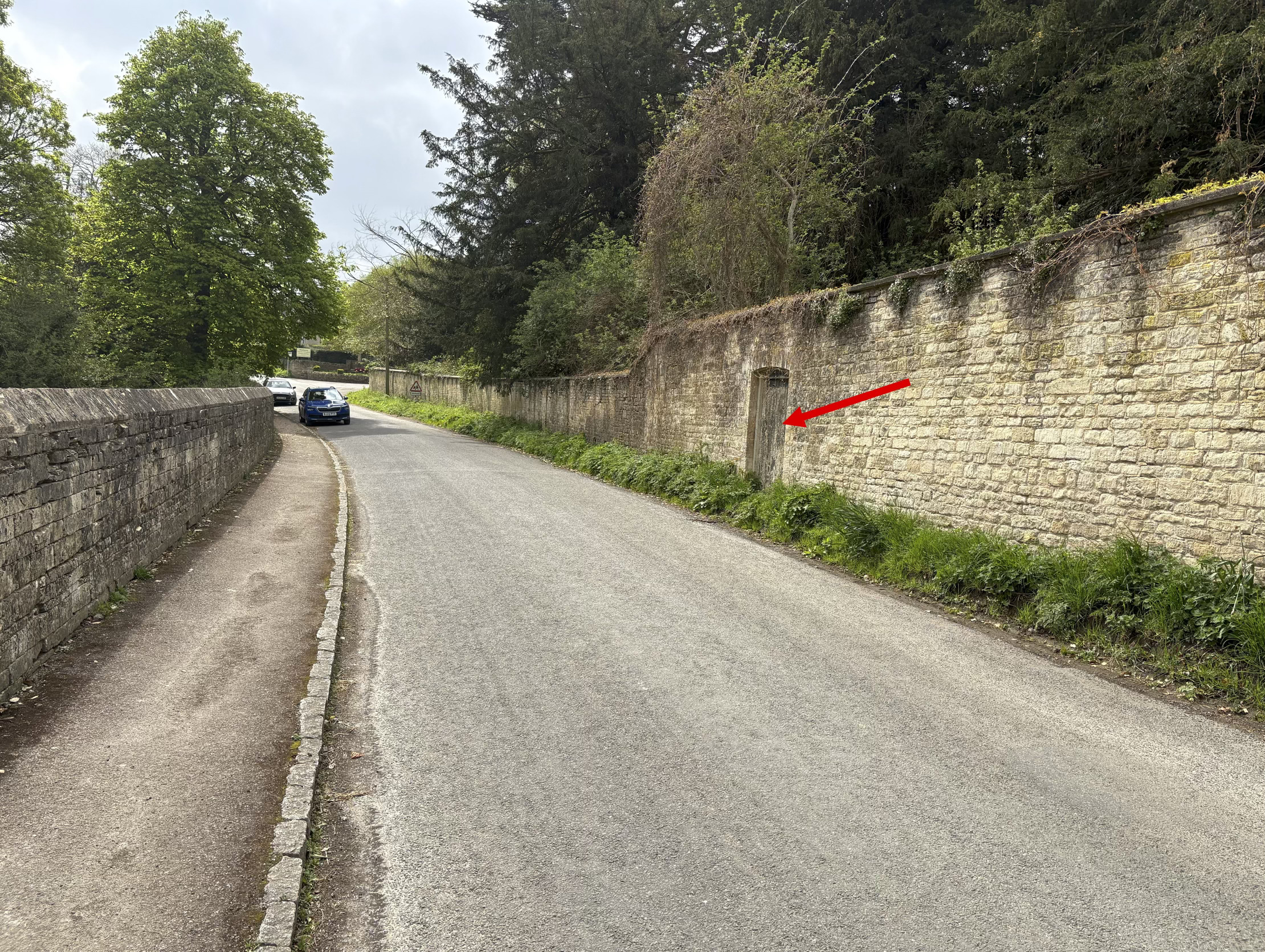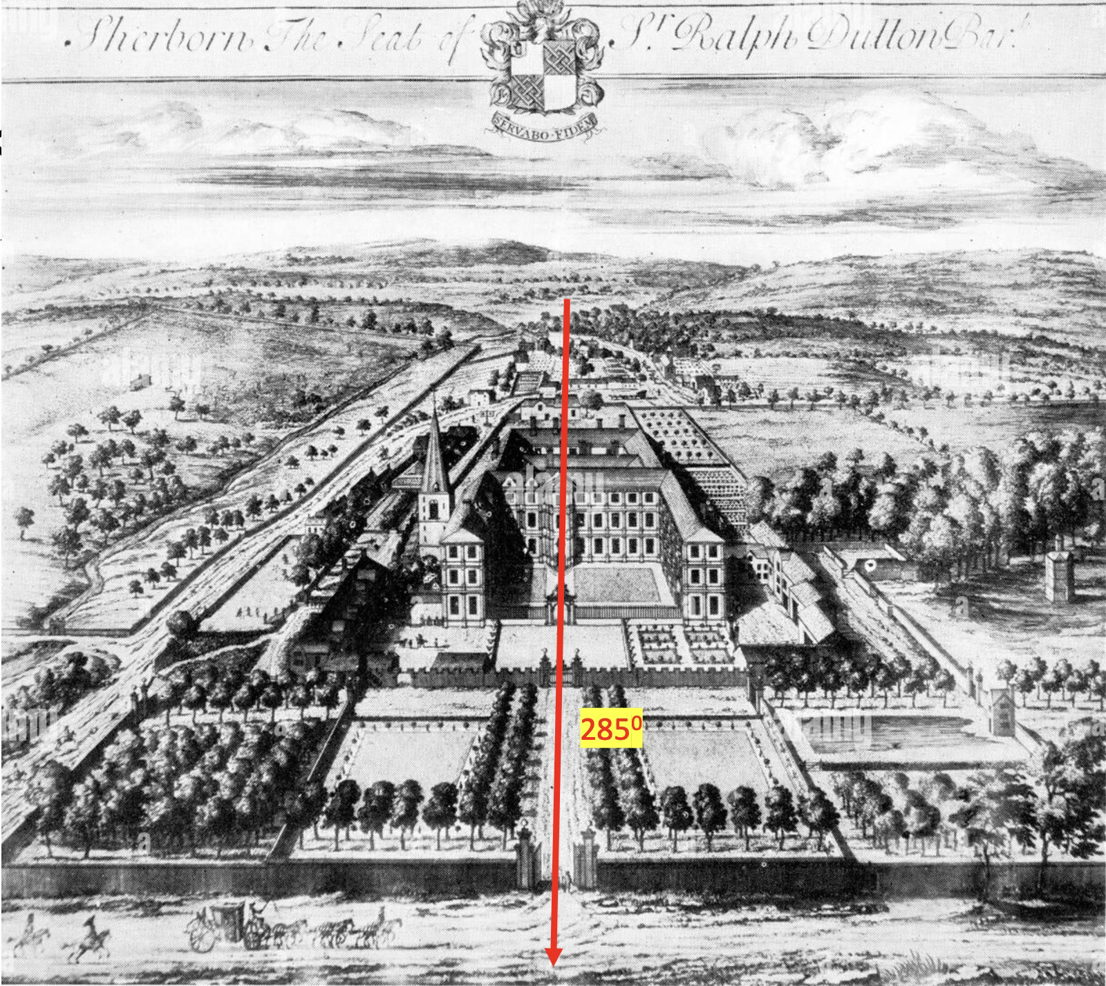 And next, another landscape design observation from the investigation into the gates and doors around Sherborne. In the photo below, on the right you can see a rotting derelict door in the wall that most of us pass every day. I’ve lined this up on the map, carefully, and it is exactly in line with the main alignment and front door of Sherborne House. For those of you who remember my recent post on the parallel alignments of the gates around Sherborne park, this line too is exactly parallel. Some careful design has been going on. This gate, the front door of Sherborne and the original main gates in front of that are aligned exactly at 285 degrees. How about that? If one extends the line further eastwards it hits Sherborne farm, exactly in the middle, which is worth a think.