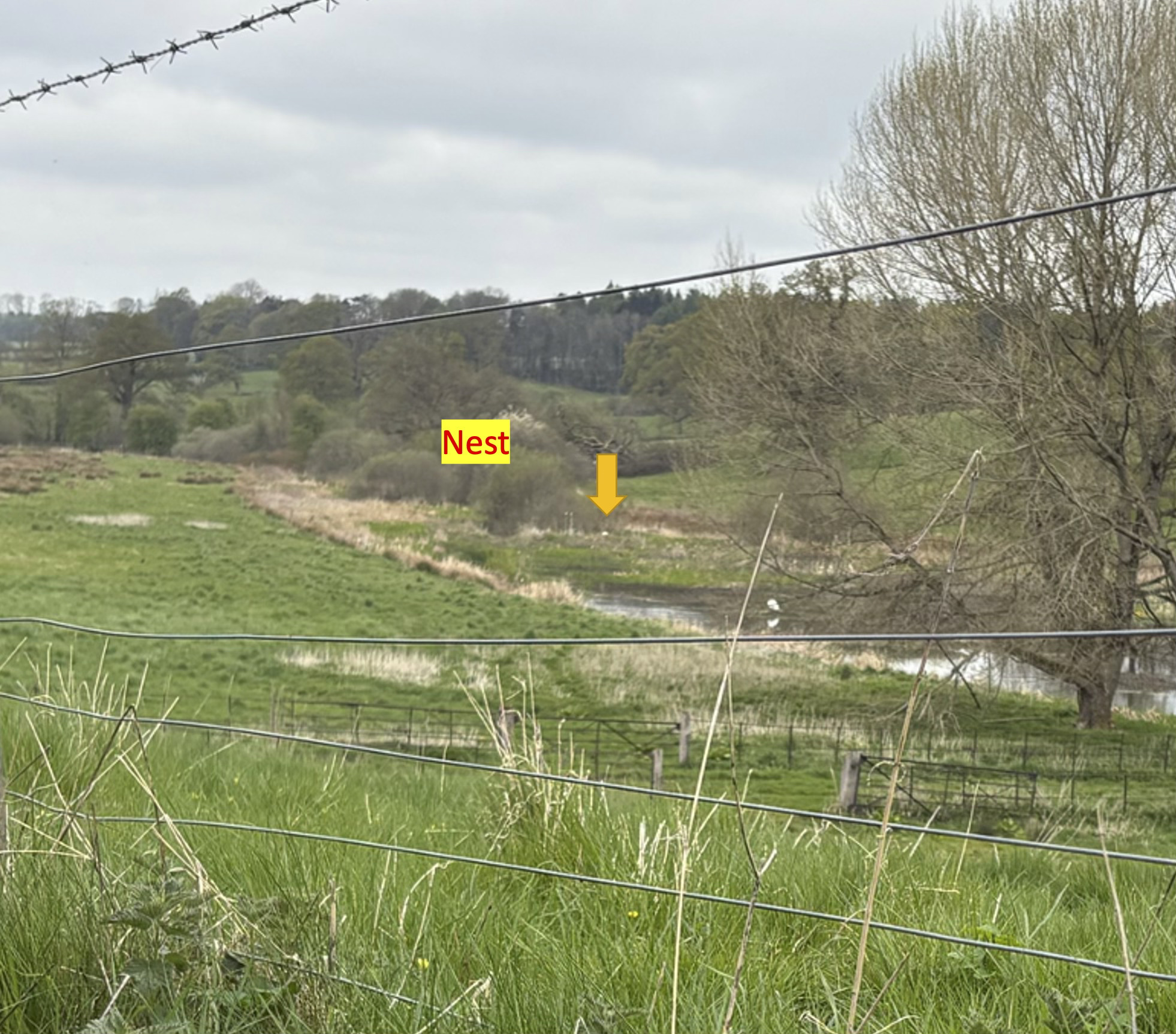 The nest is in an interesting place - upstream from the last nest but in exactly the same spot as a successful nest a few years ago. I hope that the increased silt hasn’t made a causeway by which foxes or badgers will be able to raid. Fingers crossed. Here’s a pic of the Broadwater from the village road, and below a zoom in and I have highlighted the female sat on the nest so you can see where it is