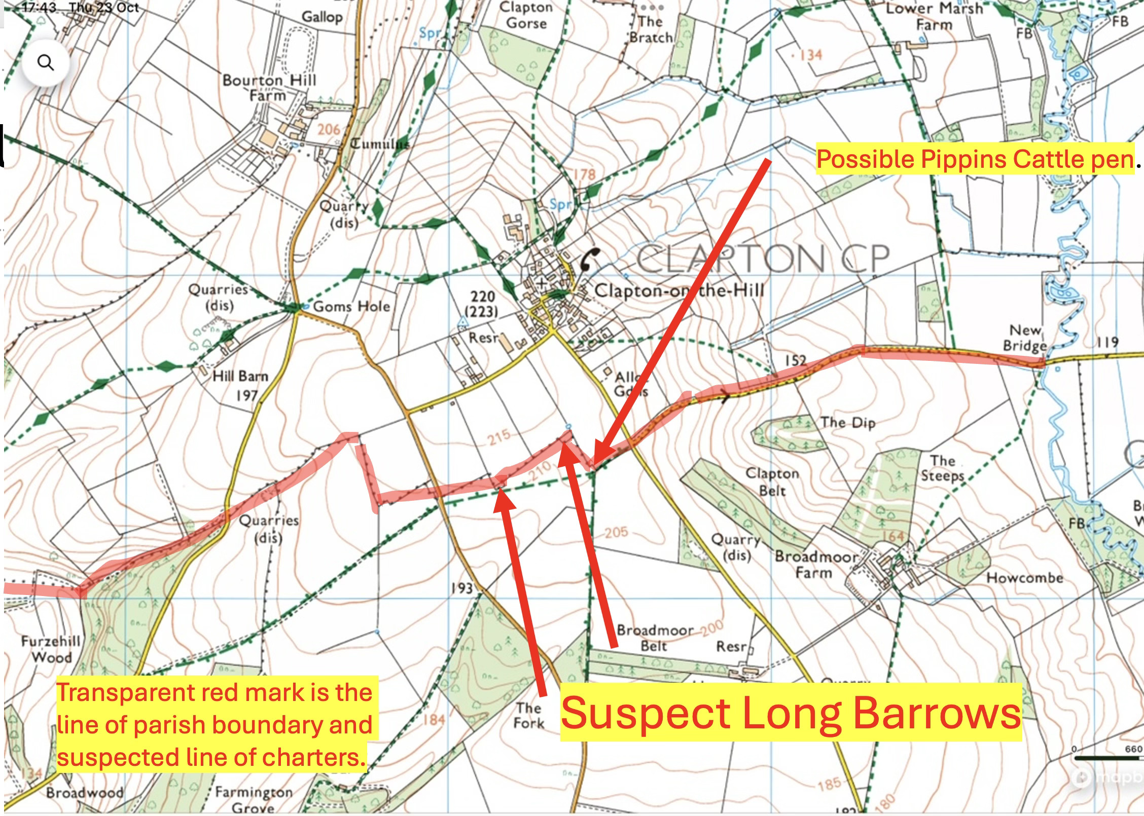 But if we follow the current northern boundary of Sherborne parish (which I think was defined c AD 800 but the charter long lost in a fire in Winchcombe Abbey in the 12th C), this runs up the road from New Bridge, past two areas which I suspect are long barrows south of Clapton, across the Sherborne to Bourton road and on down west into Broadwater Bottom (the valley running North from Farmington). This is a boundary that is defined by ancient and modern features and clear if one “walks the ground”. I show it below on a modern map.