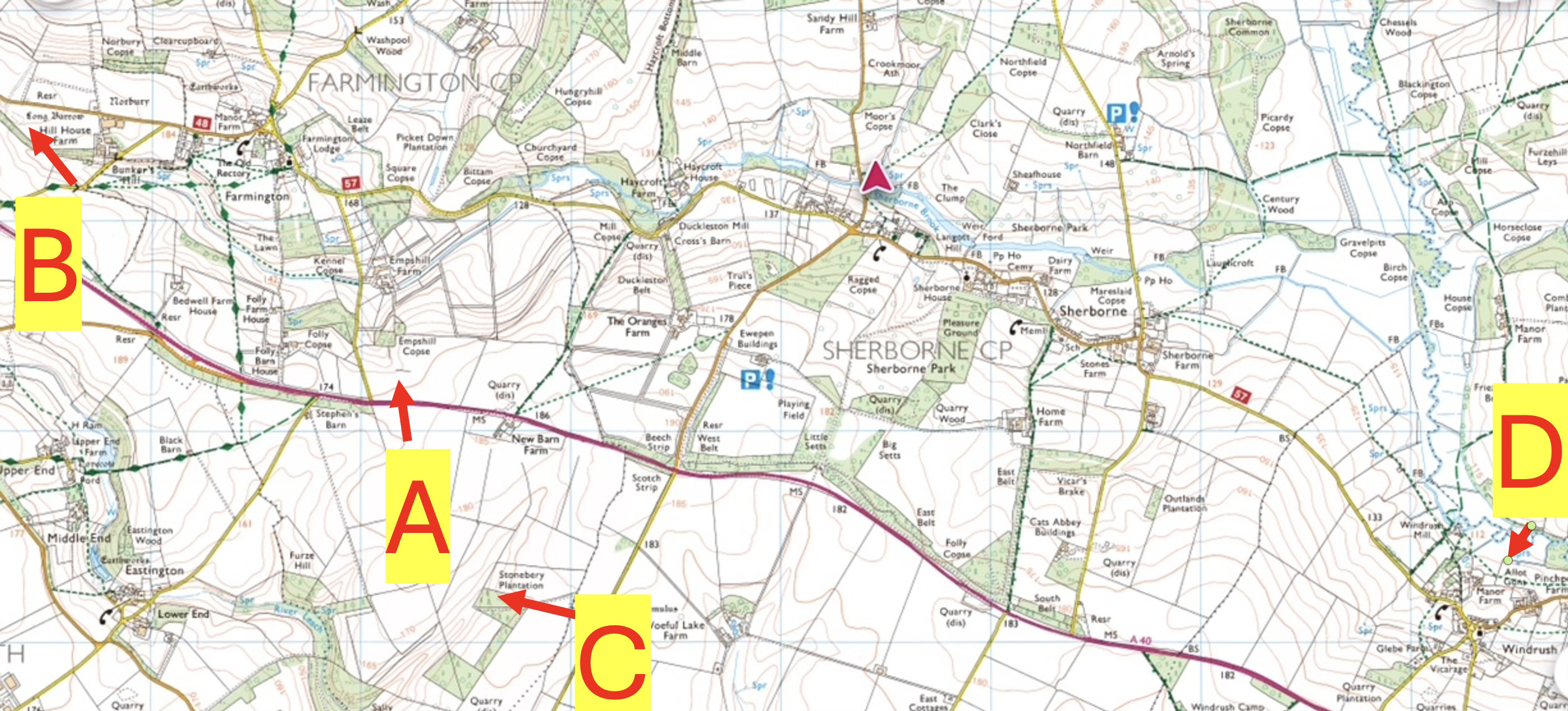 At Point D in Windrush to the East is a field called Nosebery and readers will recall we have identified a likely Long Barrow here on promontory overlooking the Windrush river, with a spring a few yards away, not far from an ancient foot path. All these features, and the faint remains of the barrow and the “-bery” suffix makes a convincing case this is Nosebery. I think the “nose” refers to the promontory it sits on.