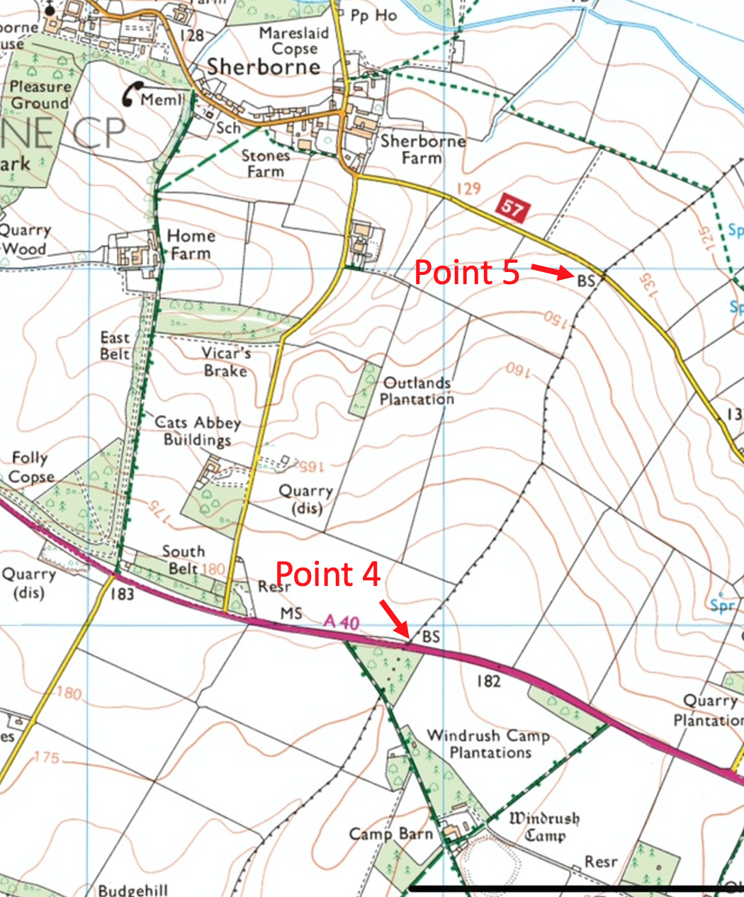 Point No 4. The modern Ordnance Survey map notes “BS” where the A40 cuts the parish boundary. BS = Boundary stone. I have not investigated this spot yet. I’ll post a pic once I have braved the A40 traffic and some dense undergrowth.