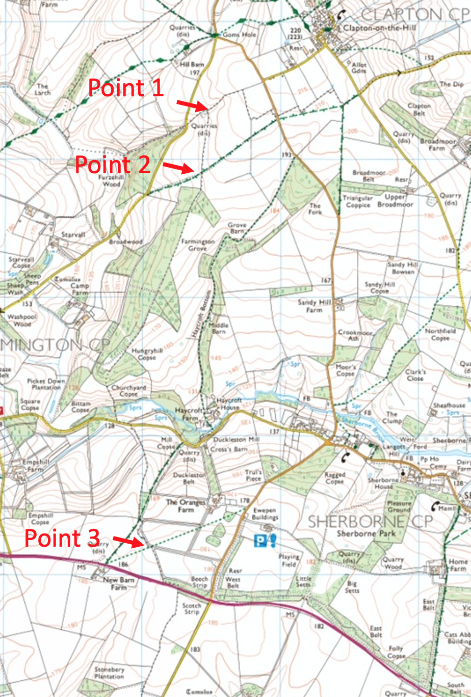 Anglo Saxon administrative areas, known as “Hundreds,” were defined between approximately 500 and 1100 AD. While some historians suggest that a “Hundred” could encompass one hundred farmsteads, this might be an oversimplification. Imagine a “Hundred” as between the size of a parish and a county, potentially containing half a dozen parishes or more. I’ll delve deeper into the administrative functions of a “Hundred” in a future post. For now, let’s focus on the boundary definitions. The western and southern parish boundaries of Sherborne are part of a “Hundred” boundary. This boundary starts just west of Clapton and runs south along Haycroft Farm, across the Brook, reaching the west of Oranges Farm before intersecting the A40. It then descends the side of the old deer course to Lodge Park. The “Hundred” boundary then continues eastward, almost reaching Windrush Camp. Considering the gift of Sherborne to Winchcombe Abbey in 811 AD, we can reasonably assume that this part of boundary dates back to at least that era. It’s possible the rest of the Parish boundary, to the East, has a similar age or it could be later.
