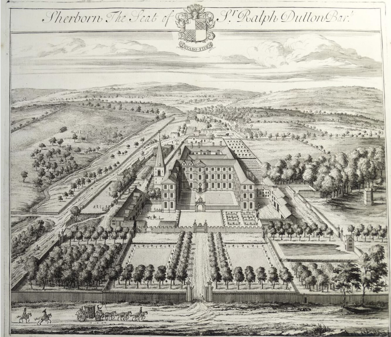 This date is interesting because we have an idea of what Sherborne looked like around that date. In 1709 or 1710 the artist Johannes Kip drew Sherborne House, and the surrounding fields and village to the East.